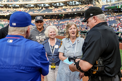 Above, members of the North Carolina Vietnam Helicopter Pilots Association pose in front of one of their four Vietnam War vintage helicopters at Camp Legacy on the National Mall during the Vietnam War Commemoration's "Welcome Home! A Nation Honors Our Vietnam Veterans and Their Families" (photo courtesy of the Vietnam War Commemoration). Below, veterans of the Red Cross Supplemental Recreation Activities Overseas program, popularly known as Donut Dollies, join umpires and coaches at home plate during "Welcome Home Vietnam Veterans" ceremonies at Nationals Park before a game between the Washington Nationals and New York Mets (photo courtesy of the Washington Nationals).