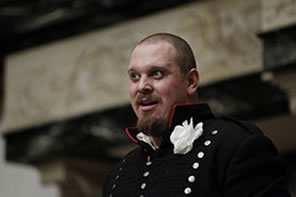 Richard, Duke of Gloucester (Benjamin Curns), addresses the audience in Henry VI, Part 3. Photo by Tommy Thompson, American Shakespeare Center.