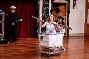 Ginna Hoben, kneeling at the front of the stage, and Jenny Bennet, standing at the back, lead the audience in playing the Super Ego of Ophelia (standing at the back corner of the stage) in the American Shakespeare Center's production of The Complete Works of William Shakespere (Abridged) [Revised] [Again]. Photo by October Grace Media.