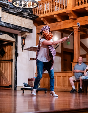 First, a quick refresher on the American Shakespeare Center’s Blackfriars Playhouse. It is the world’s only re-creation of Shakespeare’s indoor London theater, all warm wood and intimacy, the audience in close proximity on all sides, including sitting on “gallant stools” on each side of the stage. The American Shakespeare Center’s original production practices for this original production-authentic space include no amplification, no electronic or digital special effects, and the lights stay on. That last becomes a running joke as the actors would instruct the stage manager, Robert “Bob” Greene, to bring the lights up, and he’d shout back exasperatedly from his perch up in the balcony, “They’re on!” Another tradition is no fourth wall—or any wall, really, except the tiring house at the back of the stage. Thus, the action on stage spills into the audience, and vice versa. In this production, actors play audience members and audience members play actors plus a couple of goalposts and an id.