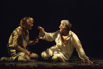 Lear in ragged white shirt and billowing brown pants, weeds stuck in his crown, his arms folded; behind, Gloucester in untucked white shirt and gray pants with knee boots stoops, crying