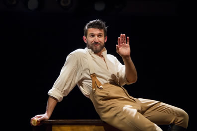 Benedick (Jonathan Cake) explains in his sololiquy why he will forever be a bachelor in the Theatre for a New Audience's production of Much Ado About Nothing. This is a rascally Benedick, whose cockiness barely masks a persistent insecurity. Photo by Henry Grossman, Theatre for a New Audience.